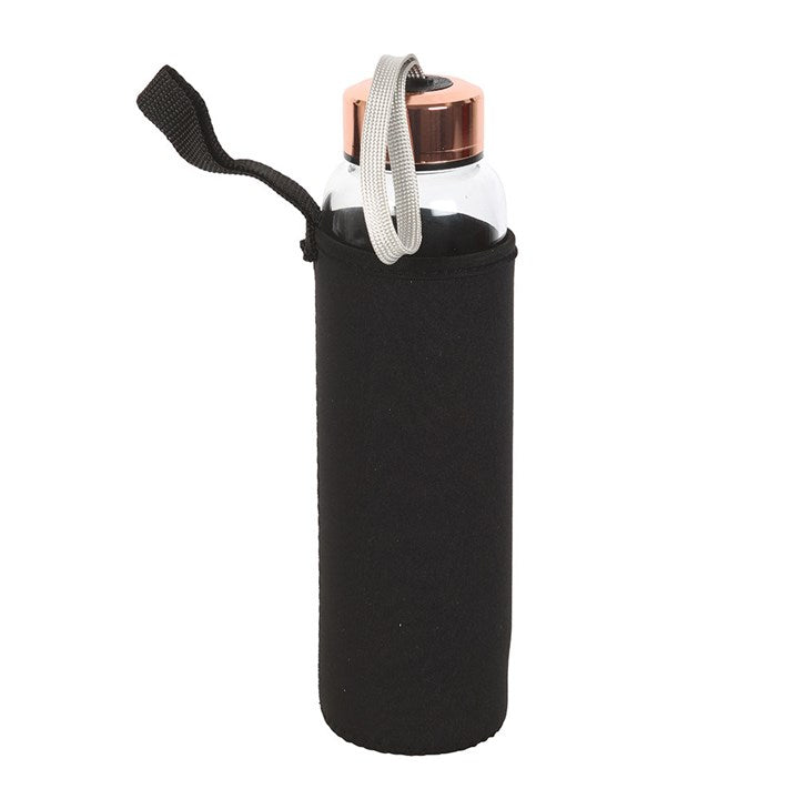 Take advantage of the claimed health benefits of clear quartz with this infused glass water bottle featuring a stunning luna moth design. Inside the bottle you'll find a natural clear quartz crystal point on a screw-off stainless steel base for easy cleaning, rubberised anti-slip bottom, stainless steel screw lid with loop strap and a neoprene cover to insulate and protect. Holds 18oz of liquid. Food safe. Recommended to be used with water only. Not suitable for microwave use. Handwash only. 500ml.