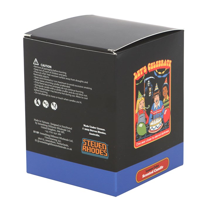 Celebrate another trip around the sun and one step closer to the void with this zesty lemon cake scented candle. Sweet, citrusy, and served with a healthy dose of existential dread. Great for birthday parties and pretending you’re happy to be there. 35-hour total burn time. Paraffin wax. Officially licensed Steven Rhodes product.